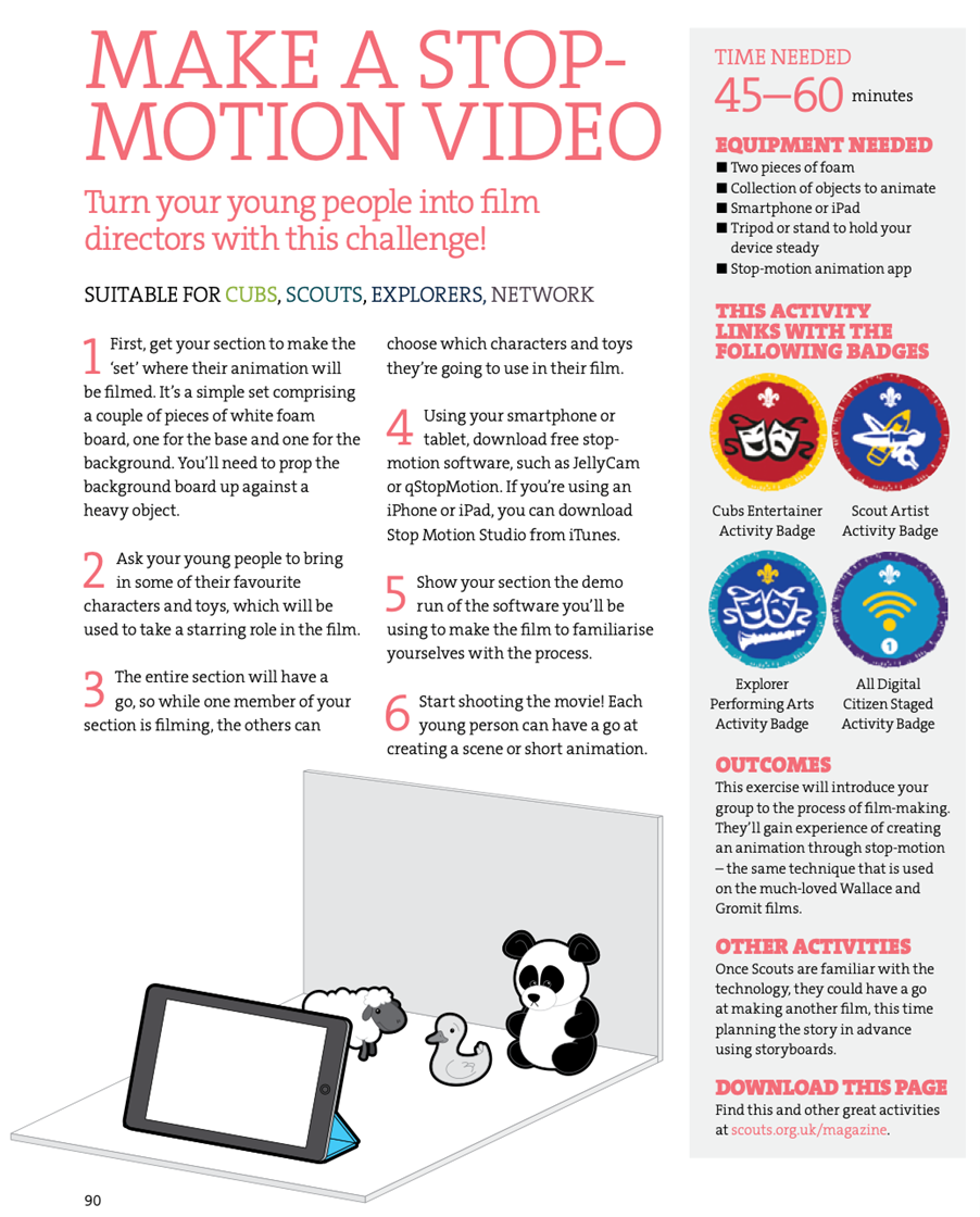 It works best with a fixed background setting and the moving parts in the foreground. You will need a secure place to fix the camera to ensure it stays in the same place for each picture. We’d love to see your Stop Motion videos via Somerset Scouts Facebook page.
